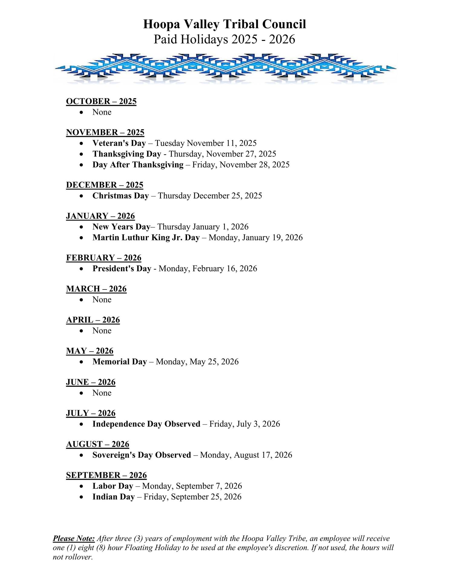 We follow the Holiday Schedule of the Hoopa Valley Tribe.